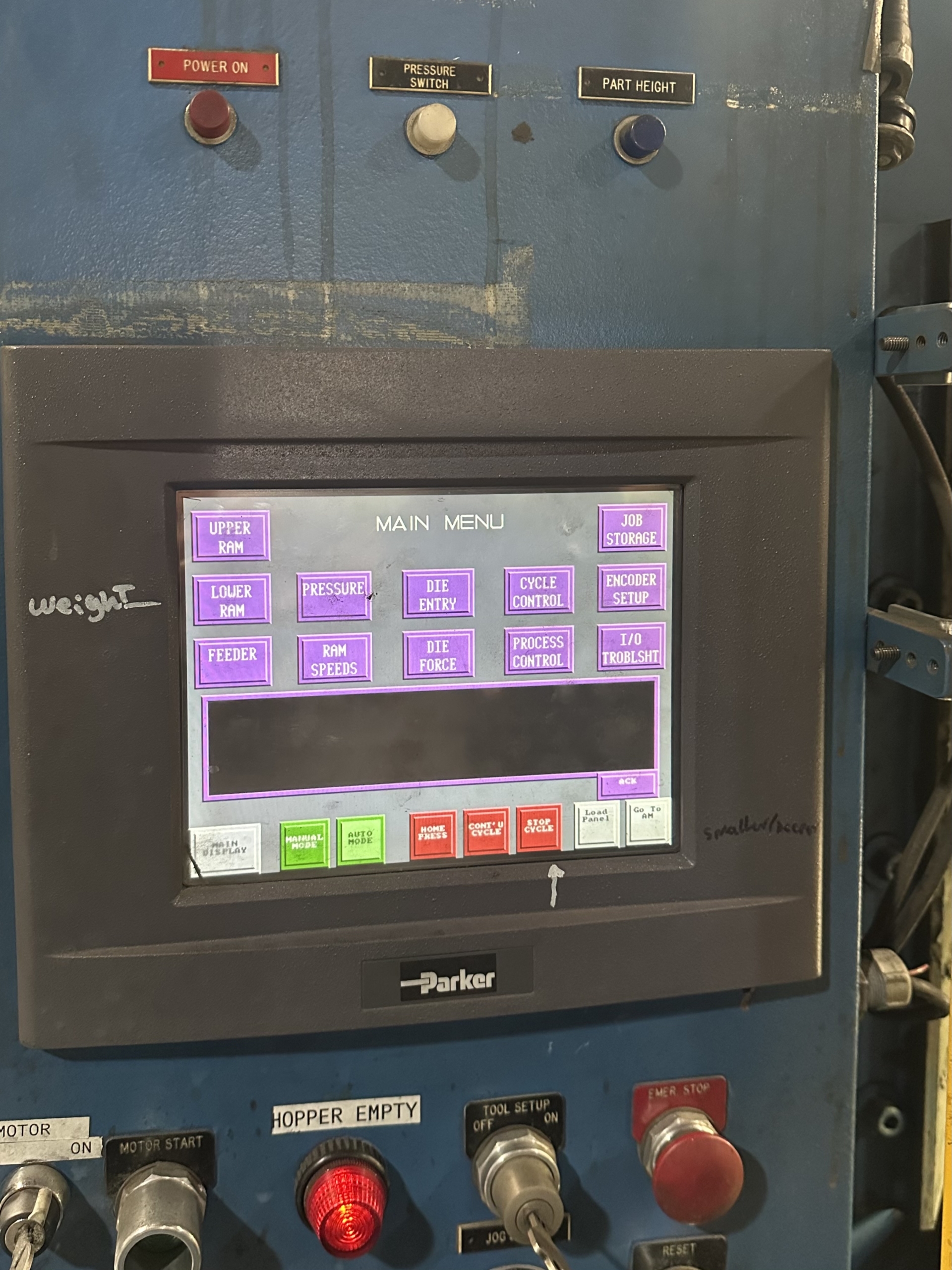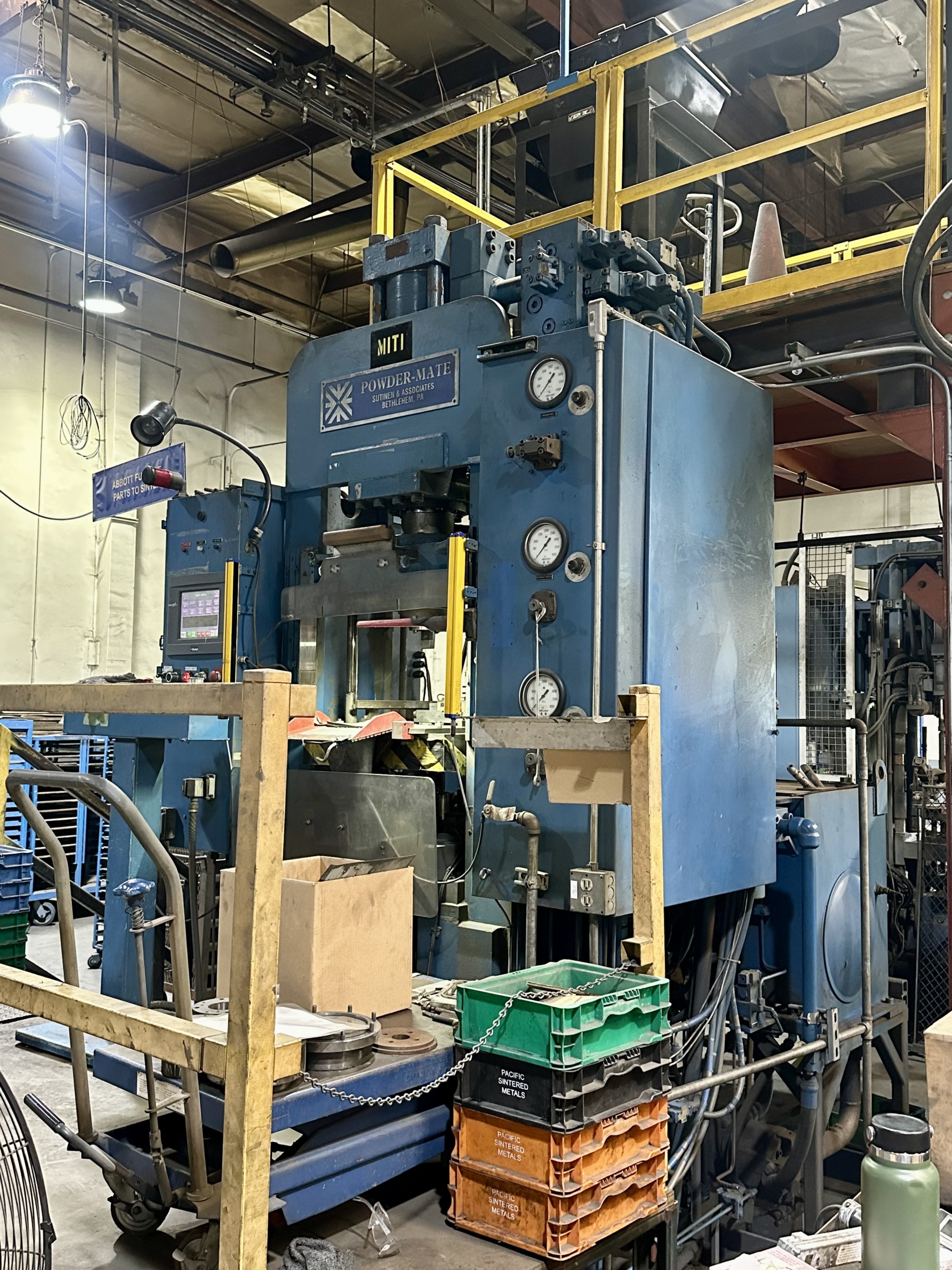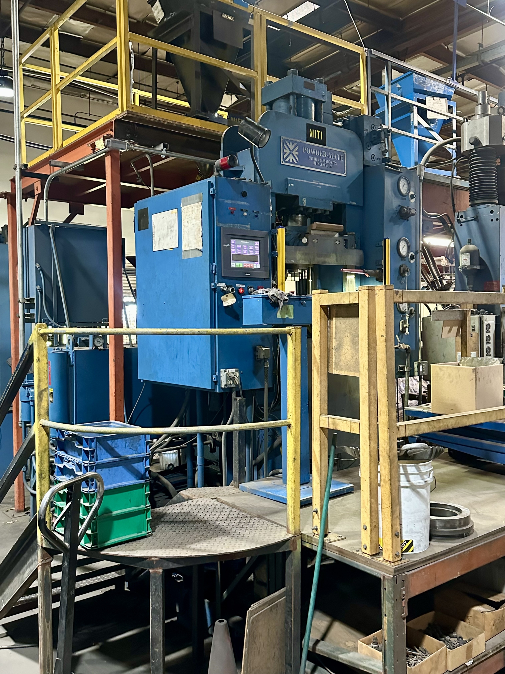 Powder Mate Compacting Press for Powdered Metal, Ceramic, Carbide, Teflon, Carbon. 125 Ton Powder Compaction Press, opposed ram, hydraulic, shuttle feed shoe, 10″ Maximum Depth of Fill, up-dated Parker PLC Controller with touch screen, 16″ Stroke of Upper Ram, 118 Ton Counter Pressure of Lower Ram, 88 Ton Withdrawal Force of Lower Ram, 40 hp motor,